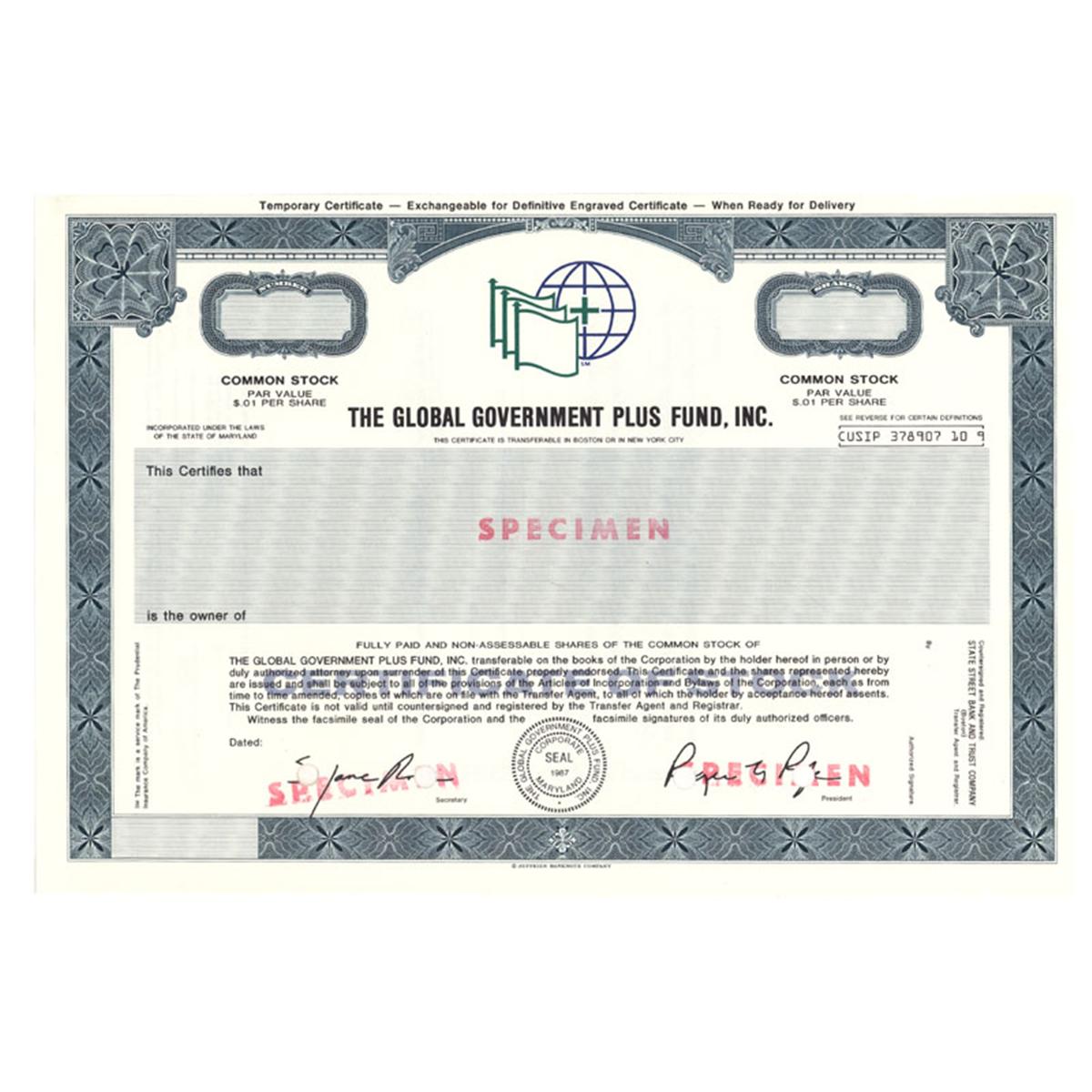 [SPECIMEN] ----, Maryland. Stock certificate specimen in The Global Government Plus Fund, Inc. Blue / Black. Green and blue Company logo at top center. Blue underprint. Specimen stamp at center and signatures. Punch cancellation at signatures. Slight crease at lower left. Overall Very Fine.