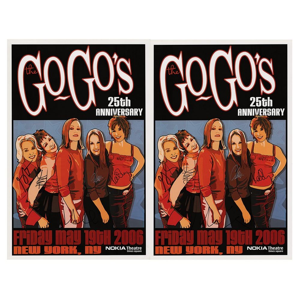 Two identical color 13 x 20 posters for The Go-Go’s 25th-anniversary concert, held at the Nokia Theatre in New York City on May 19, 2006, both signed in black felt tip by Belinda Carlisle, Jane Wiedlin, Gina Schock, and Kathy Valentine, and in silver ink by Charlotte Caffey. In overall fine condition.