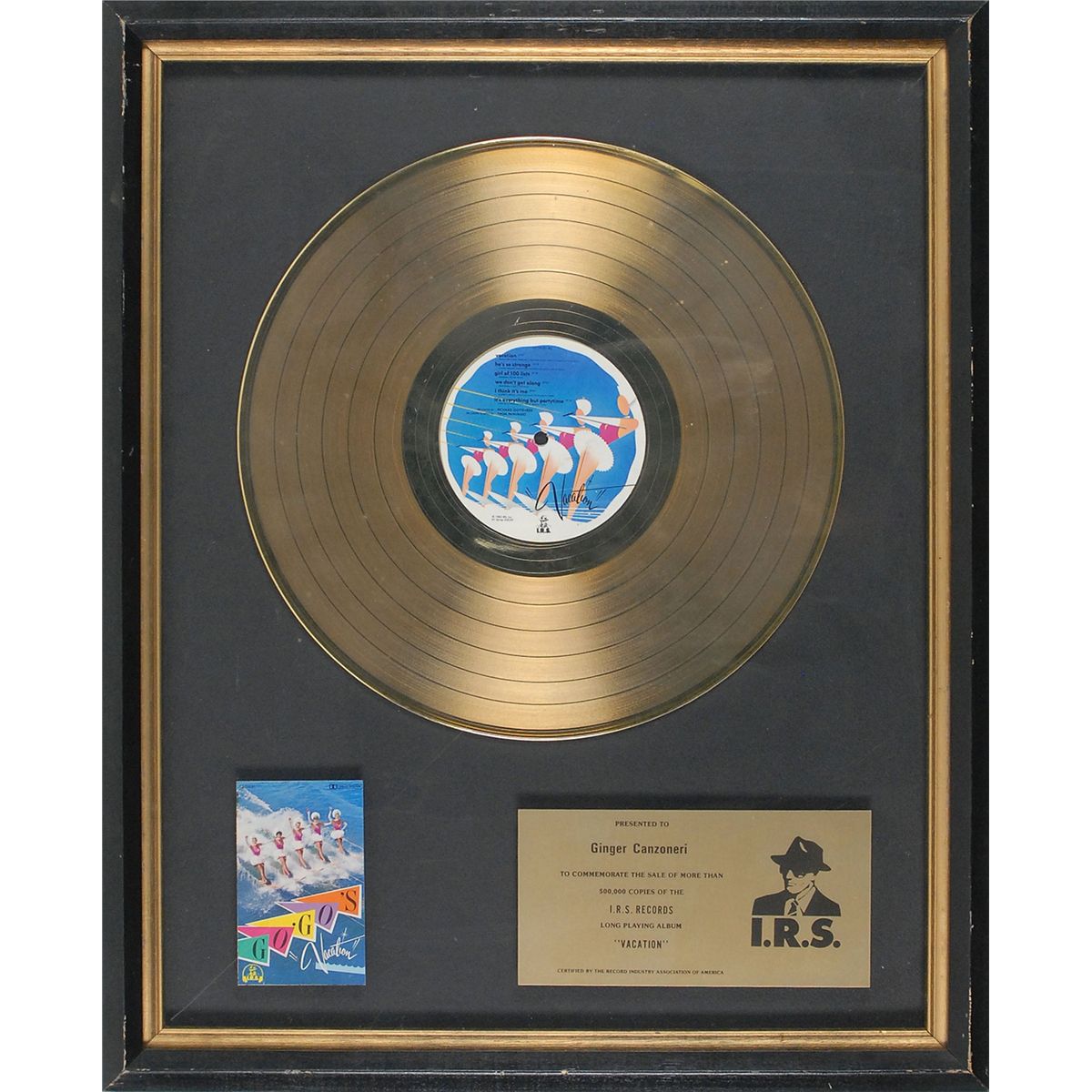 Gold record award presented “to Ginger Canzoneri to commemorate the sale of more than 500,000 copies of the I.R.S. Records…album ‘Vacation.’” The disc is framed with its presentation plaque and a small reproduction of the album cover to an overall size of 17 x 21. In fine condition.