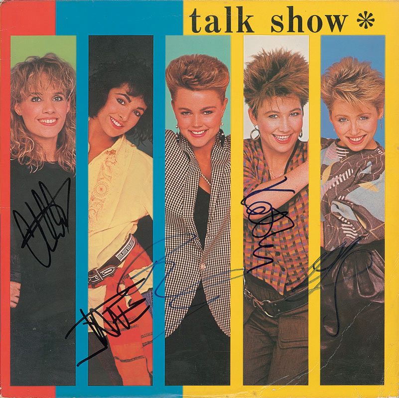 Talk Show album signed by all five members in blue and black felt tip, with most signing first name only. In fine condition, with a couple of significant creases to lower right, corner wear, and nearly indistinguishable ‘ring of wear.’ The record is included.