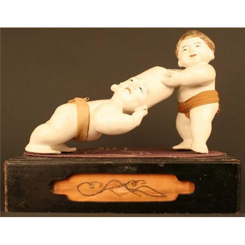 Fukurokuju, the God of Knowledge in a sumo match. Wonderfully rendered Ningyo in