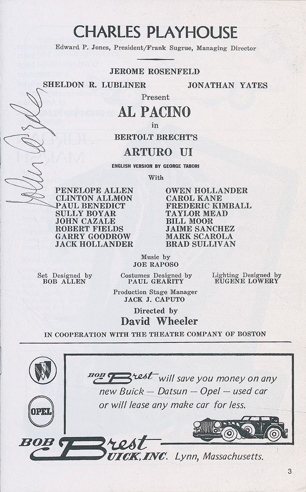 Playbill for the Charles Playhouse production of Arturo Ui, 5.5 x 9, April 1975, signed on the front cover in blue ballpoint by Al Pacino and on the first page in black ballpoint by John Cazale. In fine condition, with light scattered creases.