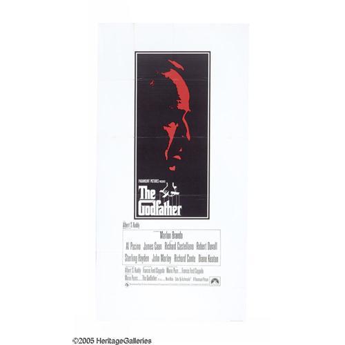 <B>The Godfather (Paramount, 1972).</B></I> British Three Sheet (41" X 81"). This legendary film revived Marlon Brando's fading career, and gave rise to many other actors including Al Pacino, Robert Duvall, James Caan, Talia Shire, John Cazale and Diane Keaton. The posters for the U.S. campaign were less than dazzling using white lettering against a black background. The British posters were far superior using a blood red profile of Brando against a black background making British posters very sought after. There are two very tiny fold separations at two centerpoints in the white area. There are two small very faint stains on the white portions of the fold lines that one has to strain to see. The bottom panel is folded diagonally, but this was done at the printers. Overall, this poster is extremely clean and could have graded higher, but due to these minor imperfections, we're giving it a Very Fine+.