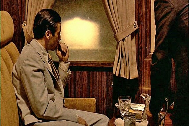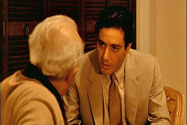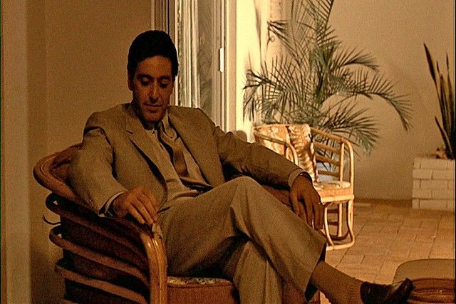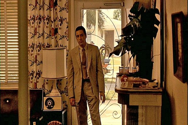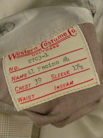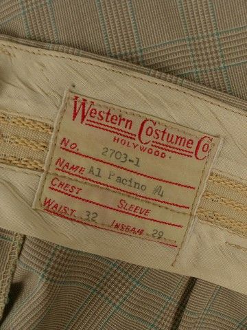 The Godfather Part II Michael Corleone (Al Pacino) Suit - Whole libraries could be filled with the books and articles written about the Godfather Saga of films. Especially "The Godfather Part II" (1974), which is considered to be one of the top ten greatest films of all time. Besides bringing back most of the original cast, director and co-writer Francis Ford Coppola brought in some of the most inspired and unusual casting in history. He used many of the great film directors and real high-level studio executives as Senators, Businessmen and Statesmen, and perhaps his most brilliant casting was legendary acting coach Lee Strasberg as powerful crime boss, Hyman Roth. Strasberg had only had two small parts in independent films in the early 1950's, and had never acting in a major film before, especially with a part of this magnitude. Of course he was best known for creating the "Actor's Studio" in New York which inspired literally hundreds of the world's greatest actors, including Marlon Brando, James Dean, Marilyn Monroe, Dustin Hoffman, and Al Pacino. That is why when we first see him in the film, the fact that he is playing his part with Pacino makes for true Hollywood gold. The scene is one of the many in this remarkable film that hangs with you forever, even though basically it is a simple piece of expository. Michael Corleone goes to Miami after he and his family are attacked at their fortress in Lake Tahoe. He blames his long time friend and confident Frank Pentageli and asks for Hyman's permission to have Pentageli killed. Although Hyman is one of the most powerful men in the world, if not the richest, he lives in a tiny modest one bedroom house in the "low-end" of Miami, and sits in a small dark room watching a football game, eating a tuna fish sandwich off a TV tray. The scene is spellbinding, haunting and magical. It has one of the most memorable lines in the film, when Michael asks Hyman if he has his permission to kill Pentageli, and Hyman, as he pops a potato chip into his mouth, casually says, as only Strasberg can: "He's small potatoes". It is as if he is chewing up and swallowing Pentageli himself! This is Al Pacino's actual hero screen worn suit from this amazing Miami sequence. It includes both his jacket and matching pants. Both the pants and the jacket have numerous official "WCC" (Western Costume Company) stamps inside (including the period marking of "1950" on both the coat and pants), as well as the original sewn-in Western Costume Co. Hollywood wardrobe label which has the production number #2703-1, Name: Al Pacino and Waist and Inseam measurements (Waist 32/ Inseam 29) type printed on them. The iconic outfit is in excellent condition. The official labels are sewn into the inside belt seam of the pants, and inside the wallet pocket of the jacket. They were original purchased from Christie's Auction House, and include both the original Christie tags, plus a Certificate of Authenticity signed by Breanna S. Livie, Vice President of Eastern Costume Company, as well as a Letter of Provenience handwritten by the consigner. From one of the most unforgettable scenes, from one of the most unforgettable motion pictures of all time, this well remembered screen used costume is a true rare Hollywood Collectable treasure.