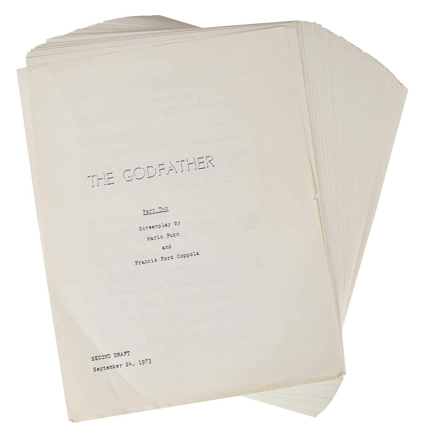 Unbound second-draft script from The Godfather Part II, 8.5 x 11, 201 pages, with the cover sheet reading: "The Godfather, Part II, Screenplay by Mario Puzo and Francis Ford Coppola, Second Draft, September 24, 1973." In fine condition. An iconic script from what many consider to be the greatest film ever made.