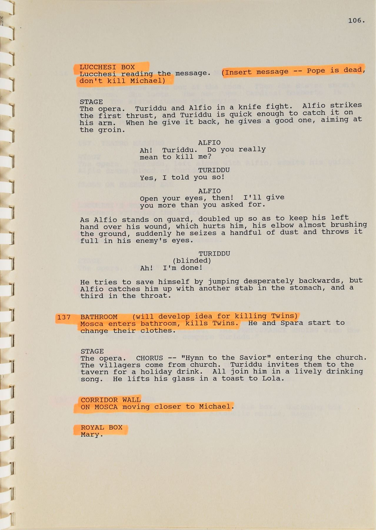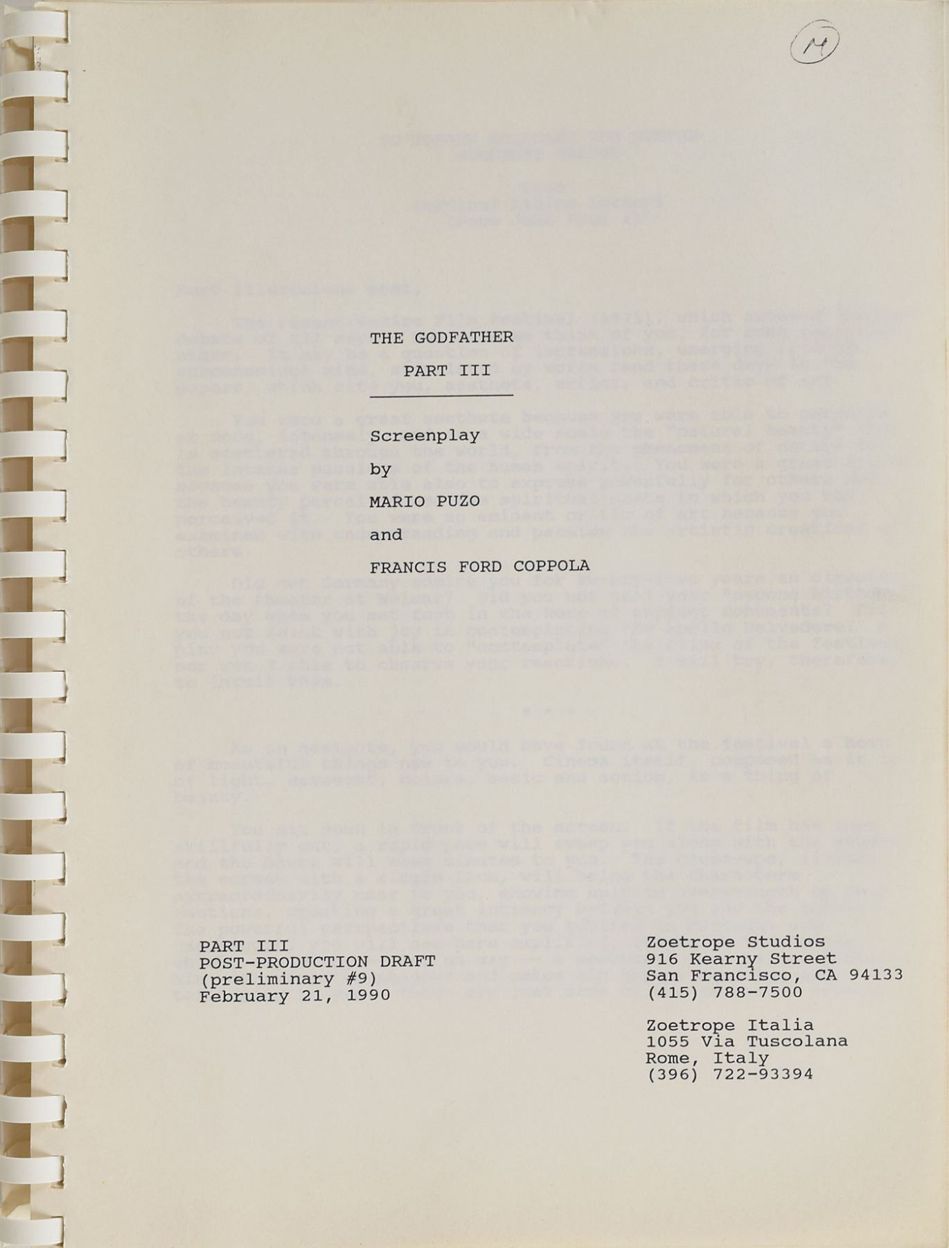 A spiral-bound editing script, with the cover sheet reading: “The Godfather Part III, Screenplay by Mario Puzo and Francis Ford Coppola, Part III, Post-Production Draft, (preliminary #9), February 21, 1990.” Several passages throughout the script are highlighted.