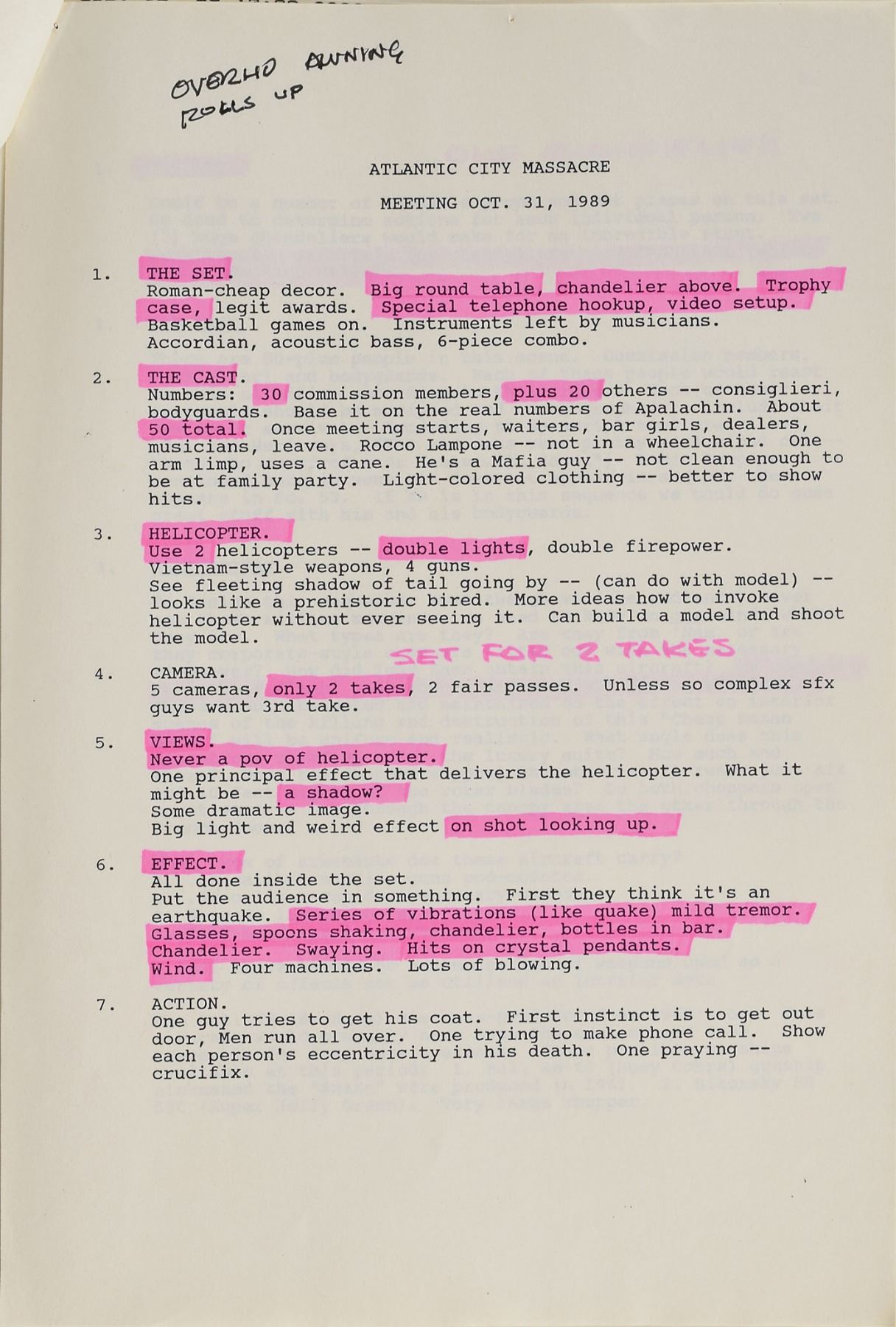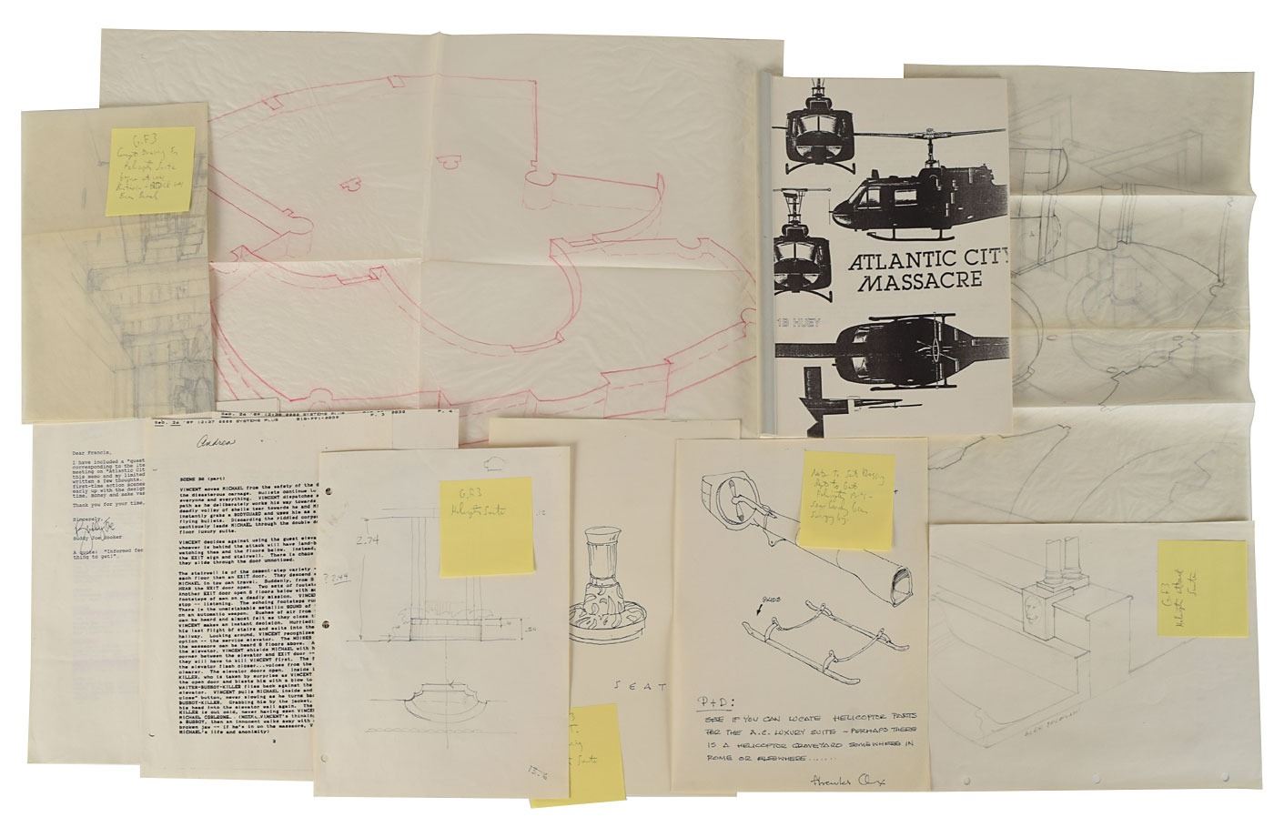 A folder of material for the Atlantic City massacre scene, considered by many to be the best scene in the movie, including: a script for the scene; a three-page production memo with notes on the set, cast, perspective, helicopters, and effects, noting that the scene should be “Not like ‘Rambo,’ more like the news footage of the slaying of Anwar Sadat’”; a two-page memo about action in the scene; and seven hand-drawn diagrams and sketches related to the scene, depicting helicopter parts and the suite that is attacked. The three largest drawings are signed by Alex Tavoularis.