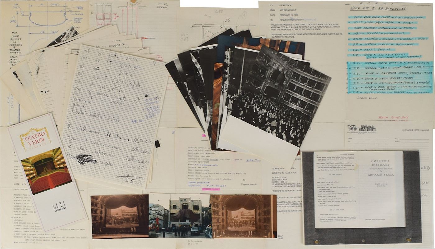 A large folder of material related to the opera house setting, including original design sketches, several notes and memos about set design and construction, internal memos about shooting locations and location scouting, and several original photographs of Italian theaters.