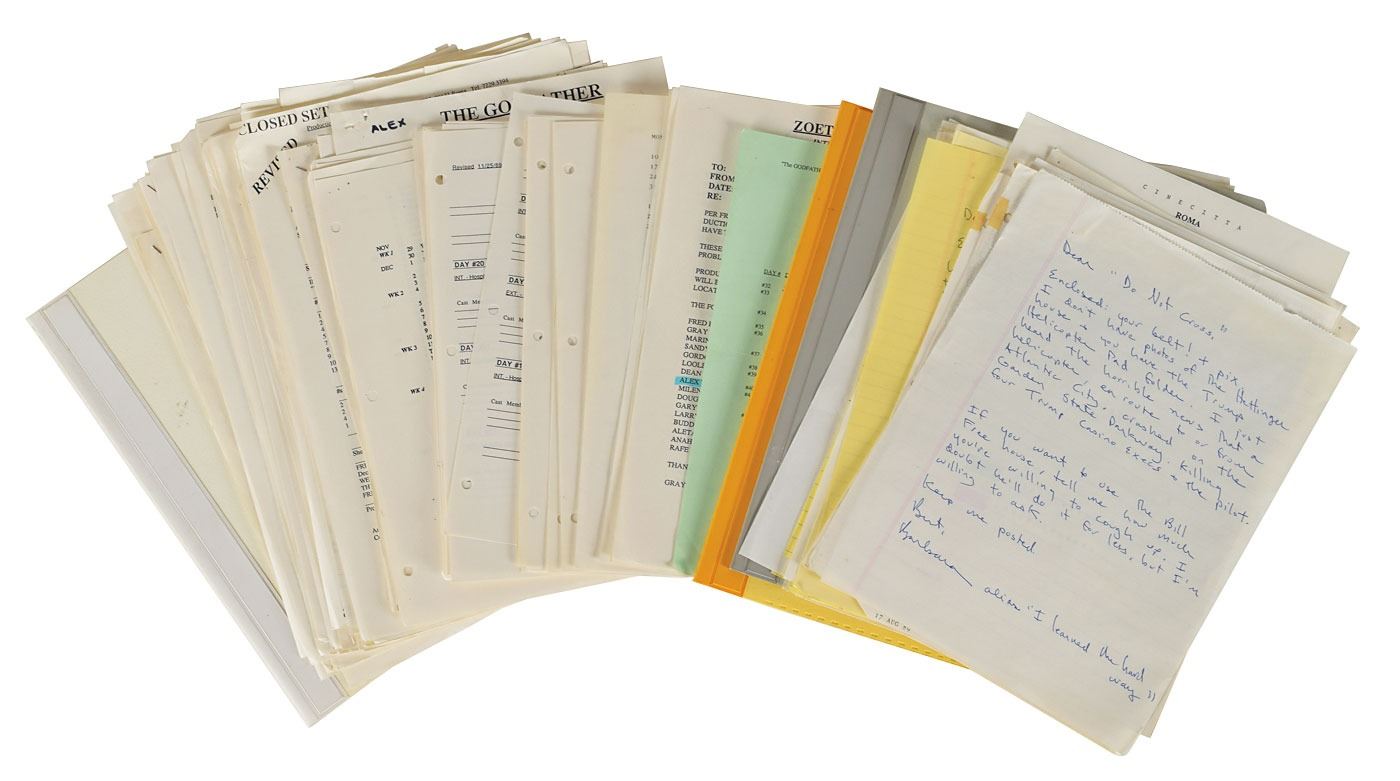 Hundreds of pages of production notes, call sheets, schedules, and correspondence related to making the film. Notably, one handwritten note reads: “You have the Trump Helicopter Pad folder. The horrible news that a helicopter, en route to or from Atlantic City, crashed on the Garden State Parkway. Killing four Trump Casino execs & the pilot.” The helicopter attack scene was indeed shot at the Trump Castle Casino Resort in Atlantic City. In overall fine condition. Although The Godfather Part III received mixed reviews compared to its predecessors, it was nominated for seven Oscars, including Best Art Direction - Set Decoration—to which the bulk of this material relates. A unique and informative archive from the production of the last installment in the iconic Godfather trilogy.