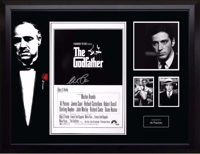 Custom framed The Godfather signed mini poster and movie collage. Mini poster autographed by Al Pacino. Approximate dimensions are 32x24 inches. This item is authenticated by PSA. This item comes with a Certificate of Authenticity from a third party authenticator. This Certification of Authenticity does not imply that the item will be certified by any other rival authentication companies. The accompanied certification is the only certification the auction company can confirm. These items are being sold as collectable pieces and there is no guarantee that this item can be resold on any online marketplace. Each of these companies has their own policies and politics.