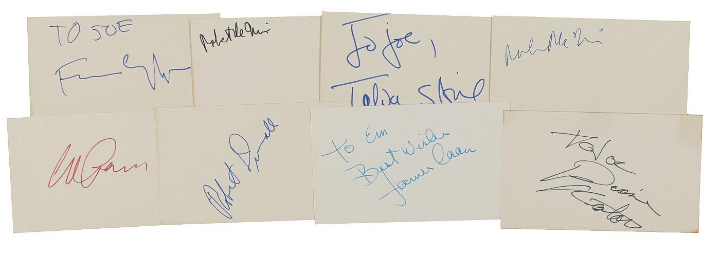 In-person ink and felt tip signatures of Robert DeNiro (2), Al Pacino, Robert Duvall, James Caan (ins), Talia Shire (ins), Diane Keaton (ins), and Francis Ford Coppola (ins) on individual off-white 5 x 3 cards. In fine condition, with a bit of mild edge toning to Keaton’s card.