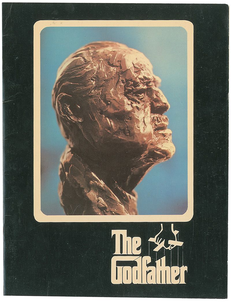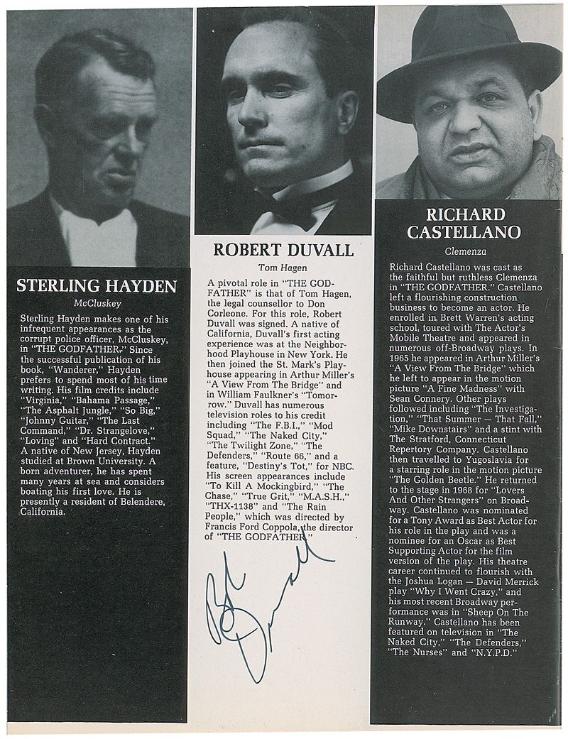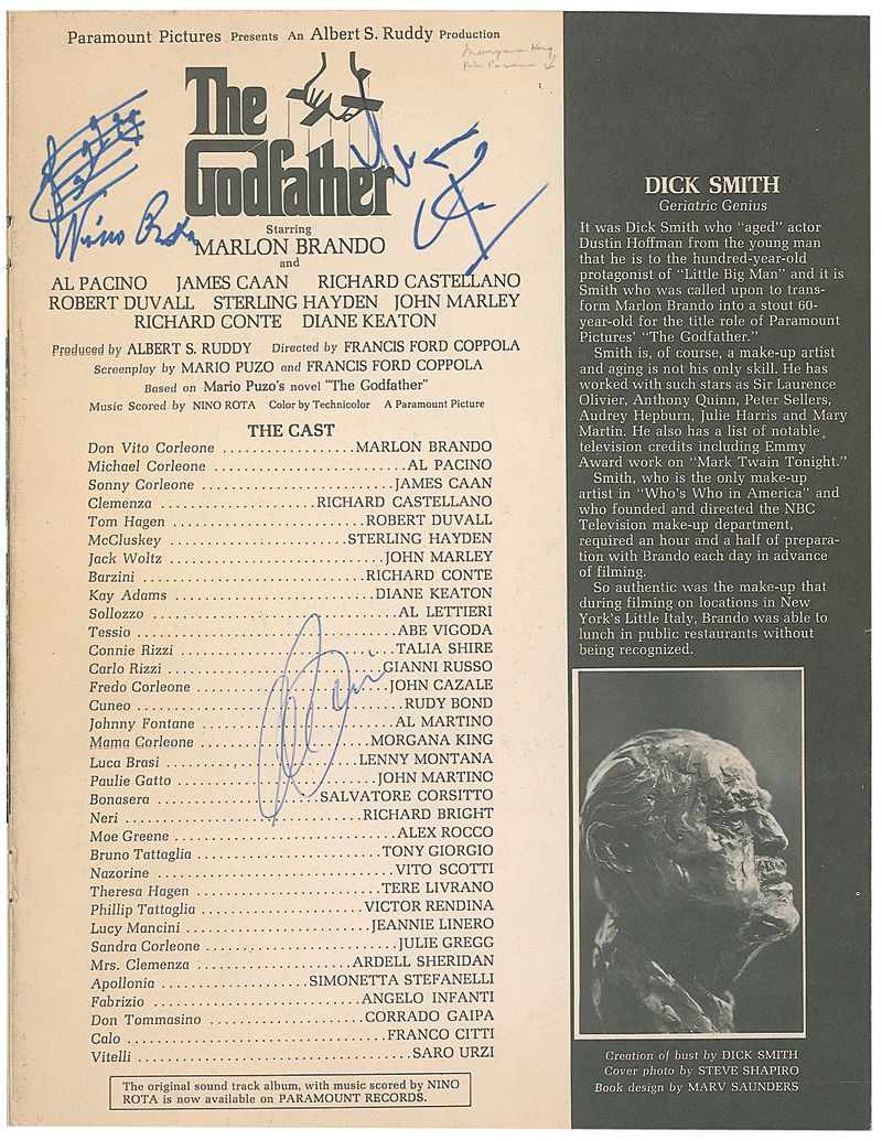 Godfather souvenir book/program, 8.5 x 11, signed on the cast page in blue ballpoint by Al Pacino, and in blue felt tip by Morgana King and Nino Rota, who adds a one-bar AMQS. Book is also signed inside in black felt tip by Robert Duvall under his photo and biography. In fine condition, with some mild toning to signed page and light handling wear.