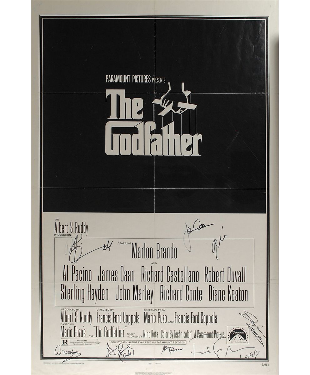 Desirable 27 x 41 one-sheet movie poster for the 1972 Academy Award-winning classic film The Godfather, signed in black felt tip by Francis Ford Coppola, Al Pacino, James Caan, Robert Duvall, Al Martino, Gianni Russo, Alex Rocco, and Diane Keaton. A few very small separations along previous intersecting storage folds, scattered light creases and edge dings, and a couple of staple holes to bottom portion, otherwise fine condition. Rolled. From the collection of noted publisher and founder of Lord John Press, Herb Yellin.