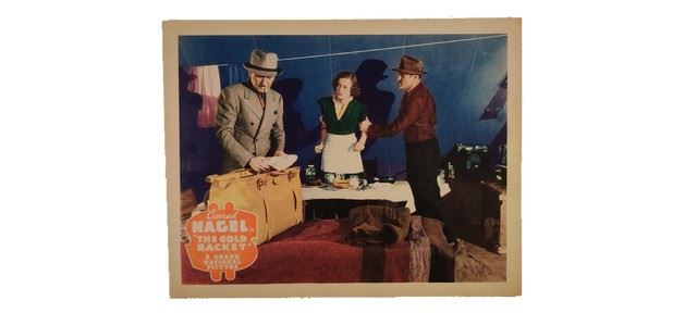 The Gold Racket (George A. Hirliman Productions. Distributed by Grand National Pictures, 1937) lobby card. Crime Drama, Film Noir. Starring Conrad Nagel, Eleanor Hunt, Fuzzy Knight, Frank Milan, James Duffy, Albert J. Smith, Warner Richmond, Charles Delaney, Karl Hackett, William L. Thorne, Edward LeSaint. Directed by Louis J. Gasnier & Joseph H. Lewis. Tape marking, minor edge wear. Excellent. (11"x14").