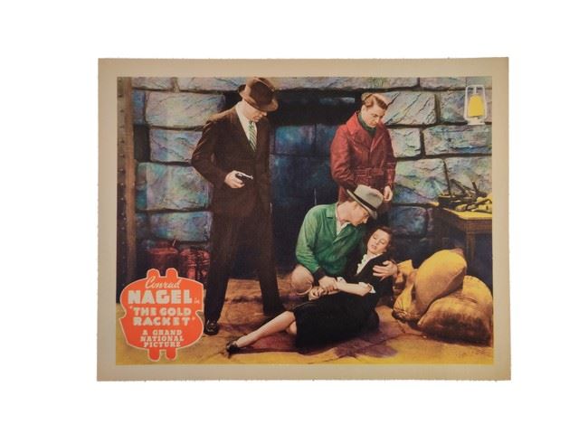 The Gold Racket (George A. Hirliman Productions. Distributed by Grand National Pictures, 1937) lobby card. Crime Drama, Film Noir. Starring Conrad Nagel, Eleanor Hunt, Fuzzy Knight, Frank Milan, James Duffy, Albert J. Smith, Warner Richmond, Charles Delaney, Karl Hackett, William L. Thorne, Edward LeSaint. Directed by Louis J. Gasnier & Joseph H. Lewis. Minor edge wear. Near Mint. (11"x14").