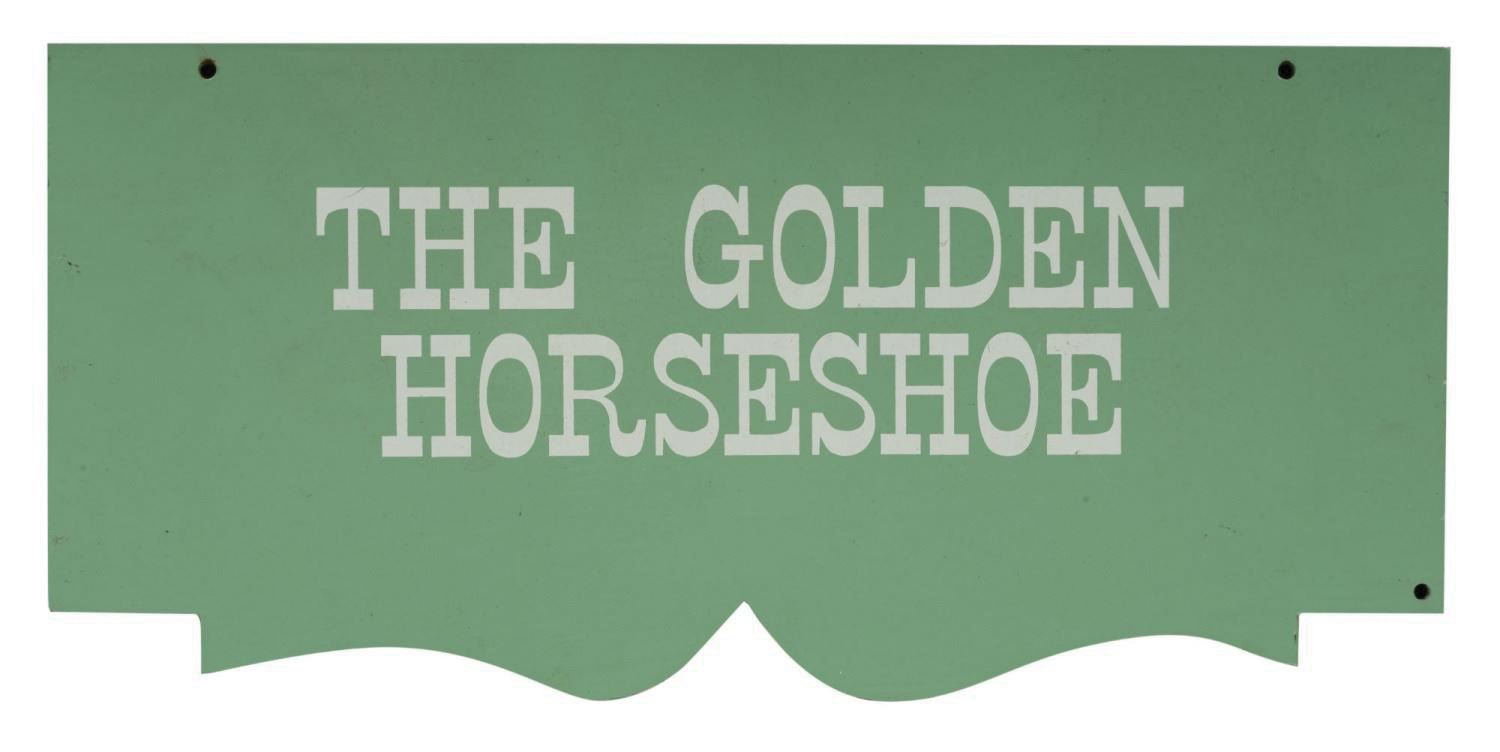 (Disneyland, c.1980s-90s) A Park-used hanging sign displayed at the major junction of Frontierland. Stationed where Orleans Street once met with Frontierland's major thoroughfare through the Stockade, this hanging sign directed audiences to Disneyland's own 1867-era saloon, The Golden Horseshoe. Measuring just over 8"x17", the vintage hand-painted sign is in very good condition with few scuffs and wear from, original Park-display.