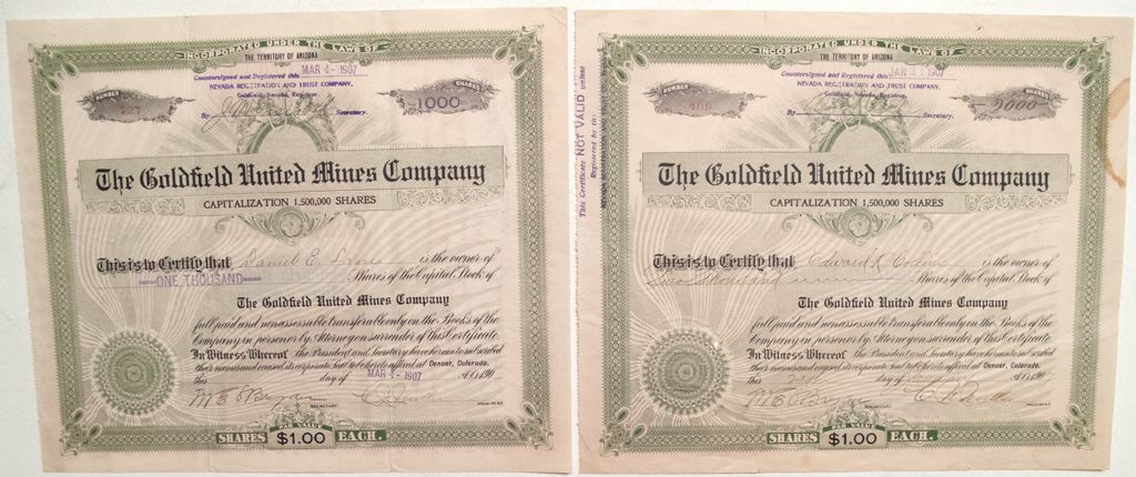 Two stocks. Numbers 409 and 727 issued in 1907. One for 1,000 shares and one for 2,000 shares. One has a stain on upper right.