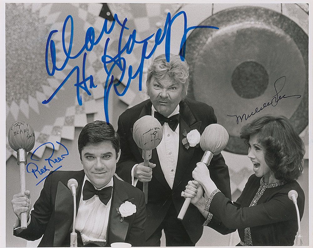 Glossy 10 x 8 photo of the Gong Show panel, signed and inscribed in blue felt tip by Rip Taylor and signed in blue felt tip by Rex Reed and in black felt tip by Michelle Lee. In fine condition.