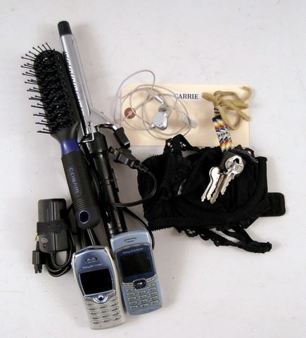 Carrie (Reese Witherspoon) screen used, hero, two cell phones, charger, curling iron, bra, hair brush, and keys from her car.