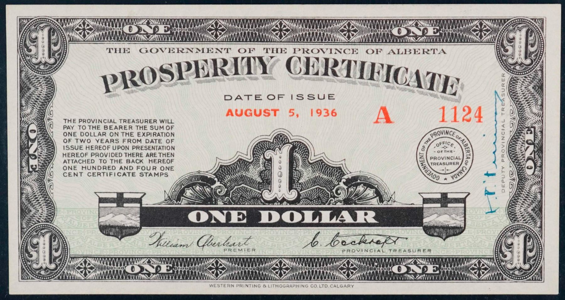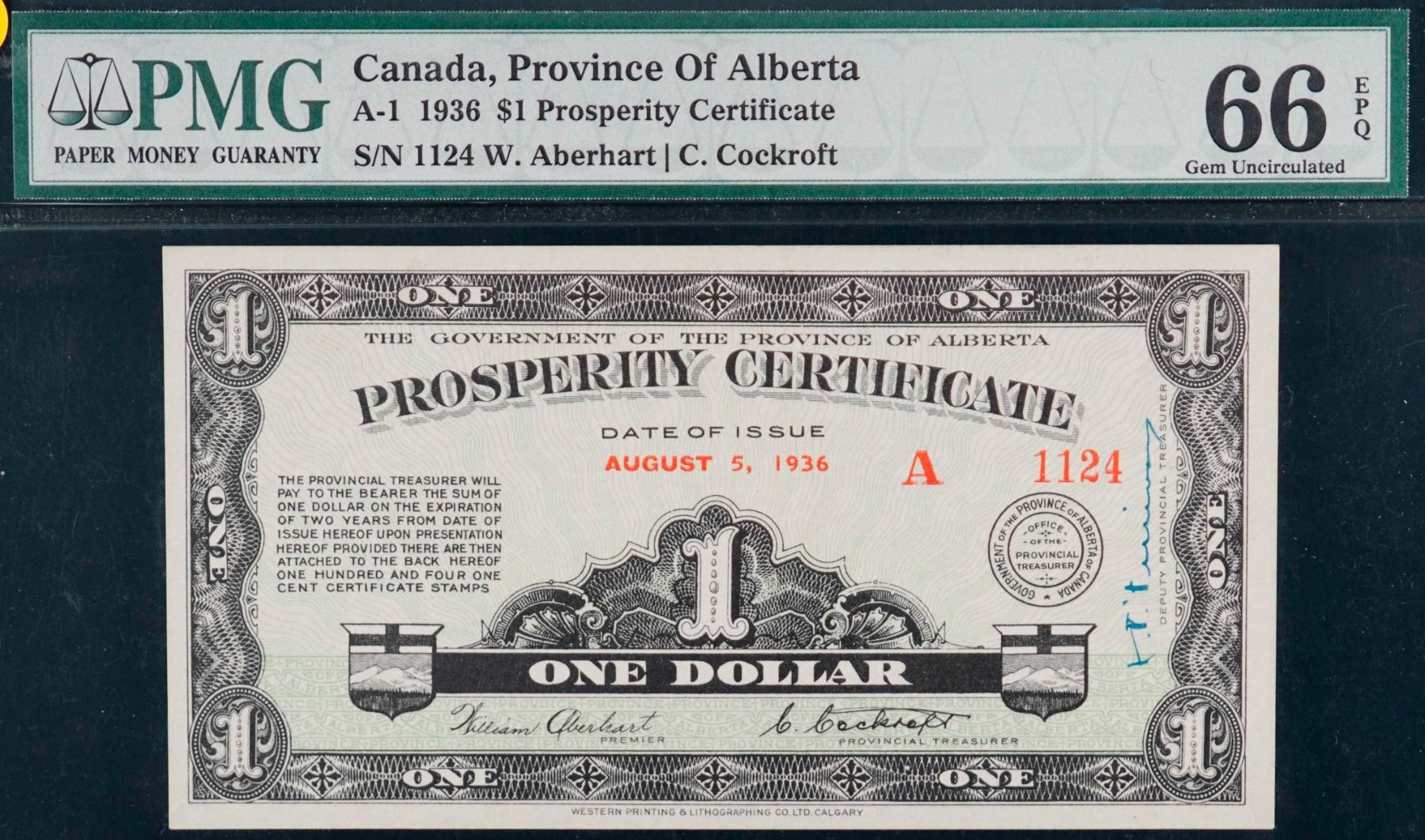 The Government of the Province of Alberta Prosperity Certificate August 5, 1936 One Dollar CH# A-1 #A1124 Very low 4 digit serial number (#s started at A 1001) PMG Superb Gem Uncirculated-66 EPQ