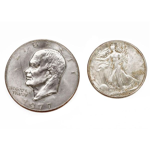 1942 US Walking Liberty half dollar, together with a 1977 Eisenhower $1 dollar; both "average circulated"