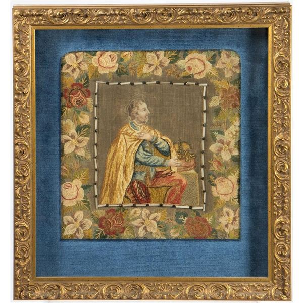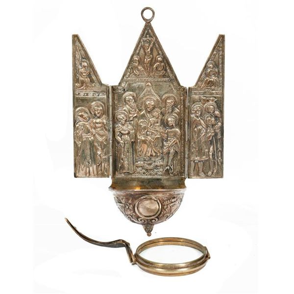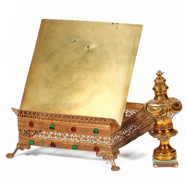 With trefoil cross on top, "IHS" device at front; easel book stand. 14 1/4in. w. x 12 3/4in. d. x 6in. h. Overall good condition; some sur...