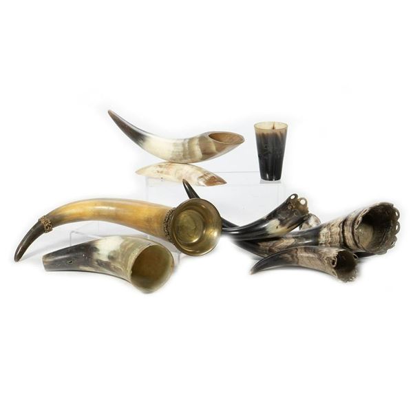 Comprised of an attached arrangement of four horns with scalloped ends, a horn mounted on a stand, one with two drilled holes and tip removed, a horn