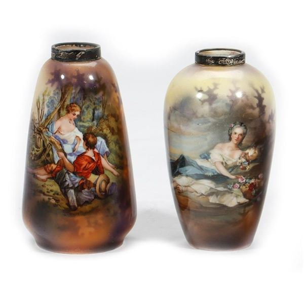 The vases are in opposite tapering forms, decorated with pastoral scenes; each stamped on base: "S&C / L". The rims with English hallm...