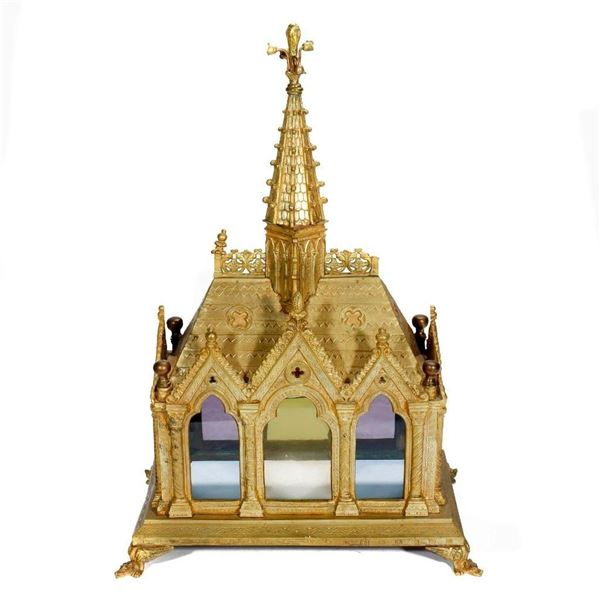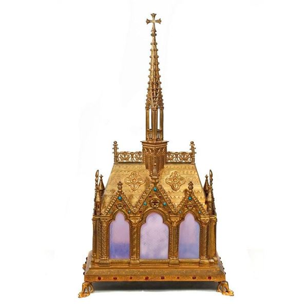 In the form of a gothic cathedral, on dragon-form feet; with red, pink, and clear green glass windows. Condition: This reliquary is missing t