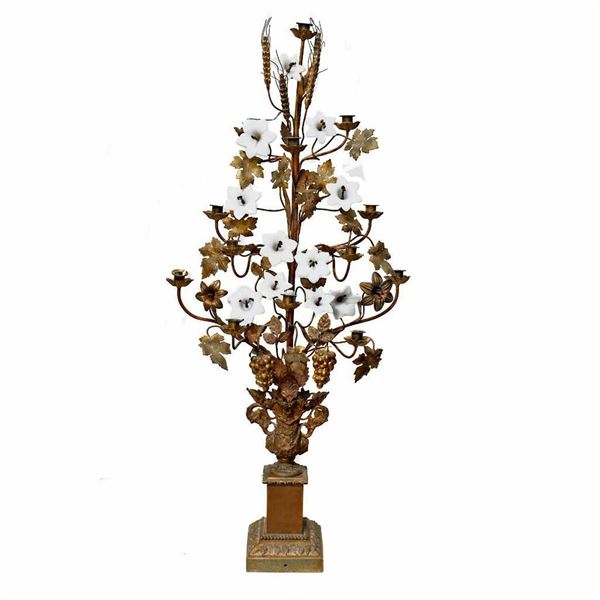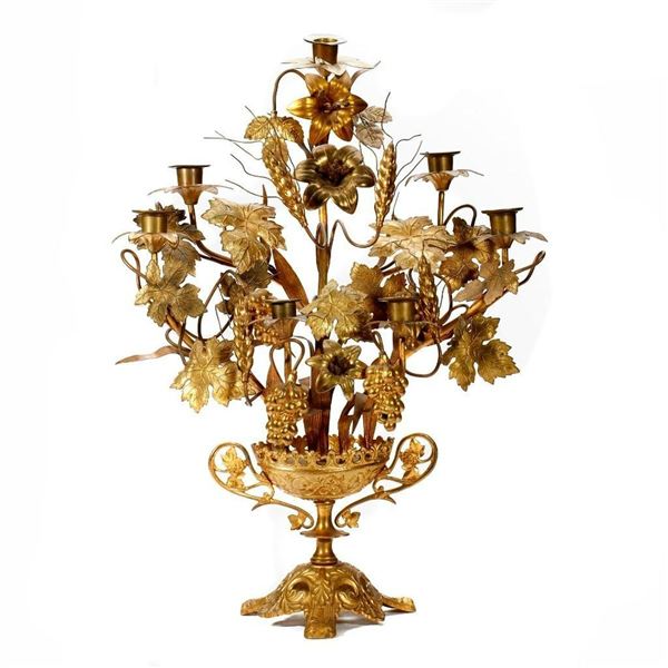 Seven candleholder arms with a grapevine and wheat motif. 23 1/4in. h. x 16 3/4in. w. x 8in. d. Overall good condition; a few candleh