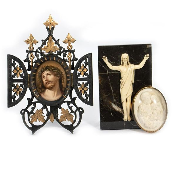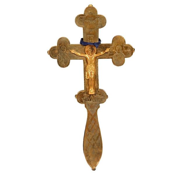 Of hollow form, with screws at points of buds; with gilt-metal Christ figure and chased decoration on both sides. 8 1/2in. x 4 1/2in.