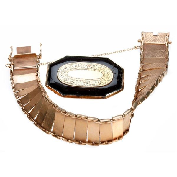 comprising a 9ct link bracelet, Henry Griffiths & Sons, together with an onyx and 10k gold brooch (with metal findings, damage to onyx); gross w...