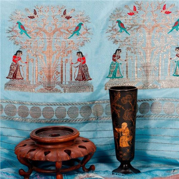 The sari with silver embroidery. Together with a round wood Chinese vase stand (overall 4 1/2in. diam.), and a small gilt-lacquer bud vase (4 1/2in.)