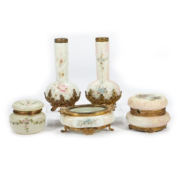 Most of the vases with applied leaf decoration, all unmarked or numbers only. Ranging in height from 4in. to 6 1/2in. Condition: Several with chips to