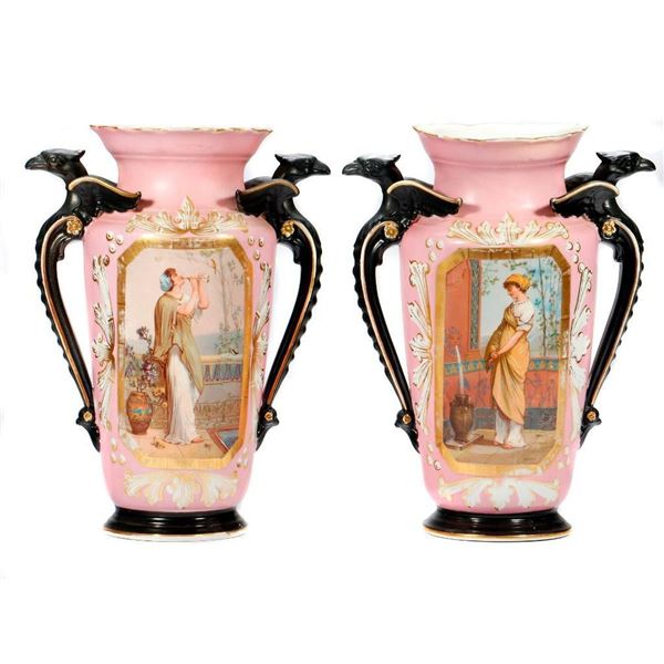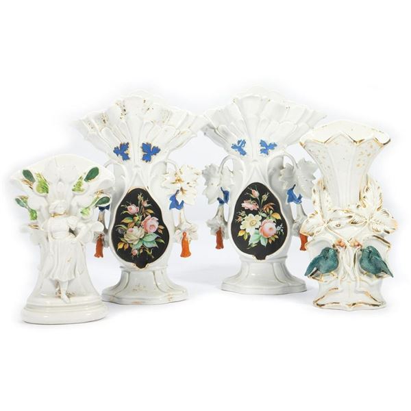 Each flaring/fan-form vase with hand-painted decoration, including two pastoral ladies; all unmarked/numbers only. Ranging in height from 9in. to 11 i