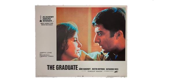 The Graduate (Embassy Films, Lawrence Turman. Distributed by United Artists, 1967) lobby card. Drama, Romance. Starring Dustin Hoffman, Anne Bancroft, Katharine Ross, William Daniels, Murray Hamilton, Elizabeth Wilson, Buck Henry, Brian Avery, Walter Brooke, Norman Fell, Alice Ghostley, Marion Lorne, Eddra Gale, Richard Dreyfuss, Mike Farrell, Elaine May, Ben Murphy, Kevin Tighe. Directed by Mike Nichols. Light creases, pin-holes. Very Fine. (11"x14").