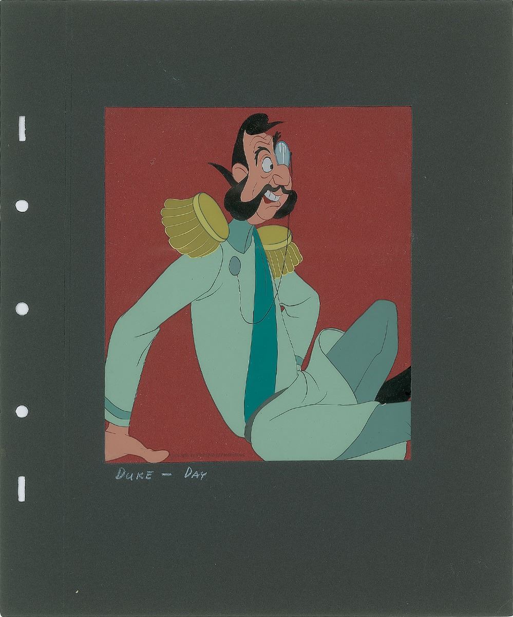 (Walt Disney Studios, 1950) Original production cel featuring The Grand Duke from Cinderella, showing the monocled and baffled Duke in a seated position. White artist’s pencil on original animation mat reads, “Duke—Day.” Image measures 6 x 6.75, with a same-sized mat opening. Mat dimensions are 10 x 12. In fine condition.