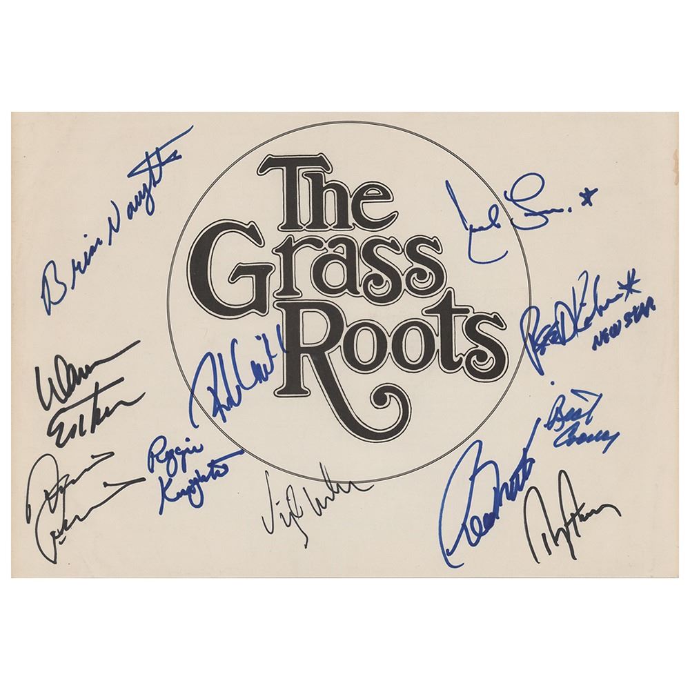 Scarce complete set of felt tip signatures of 11 members of The Grass Roots—Rob Grill, Warren Entner, Rick Coonce, Creed Bratton, Dennis Provisor, Joel Larson, Brian Naughton, Virgil Weber, Reed Kailing, Reggie Knighton, and Terry Furlong—on a trimmed 12 x 8.5 album insert. In very good to fine condition, with light edge creasing. An impressive assemblage of the popular rock band, including several members who have either passed on or retired from music; the consignor notes that all of these signatures were obtained in person.