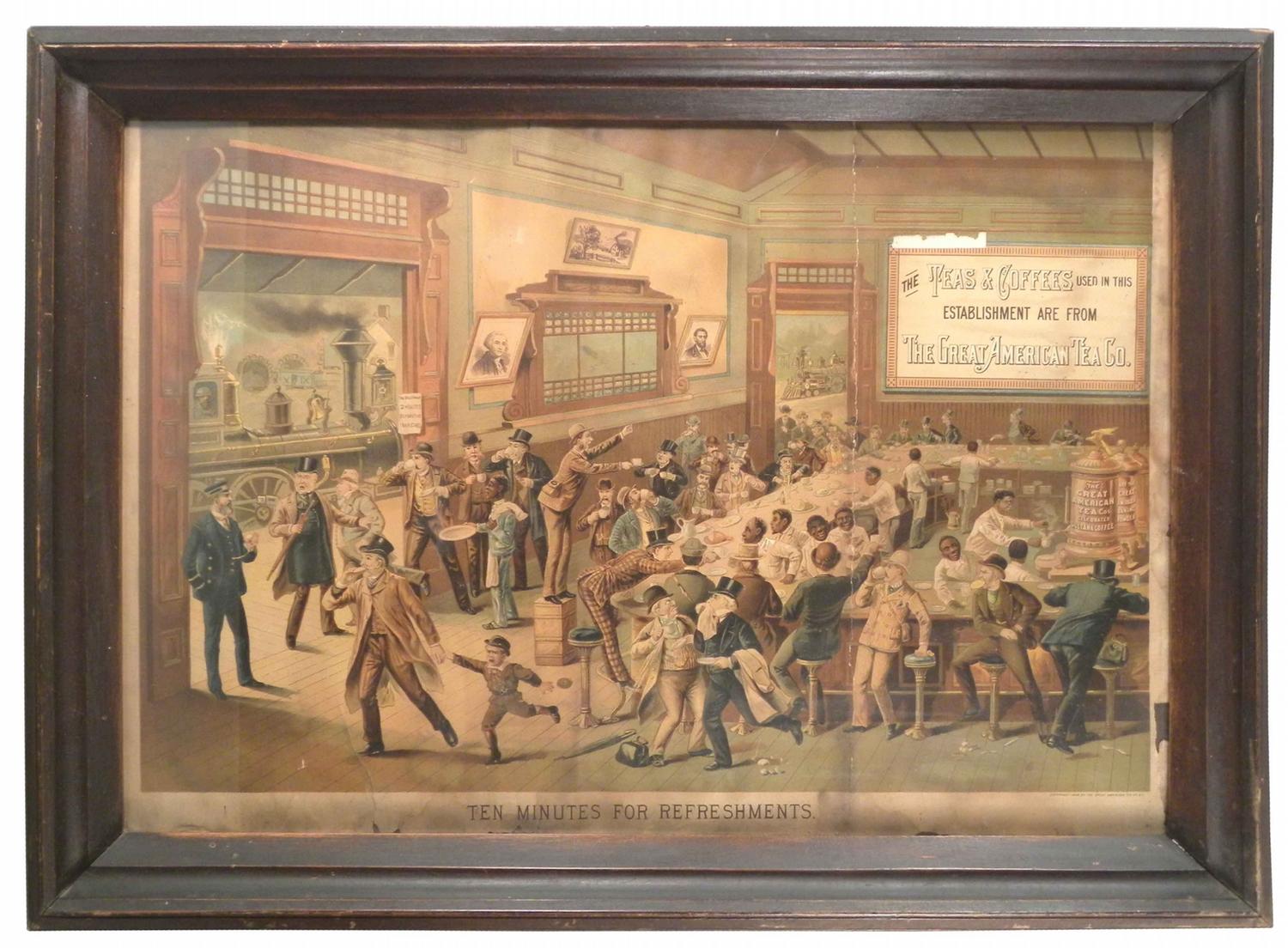 The Great American Tea Company Paper Sign. Entitled, "Ten minutes for refreshment". Copyright 1886 by Great American Tea Co. NY. Depicting the hustle of a train station and its coffee counter. Great graphics with black Americana influence. Split from 1/5:00, tears and stains. Fair condition. 30 X 21 inches image only.