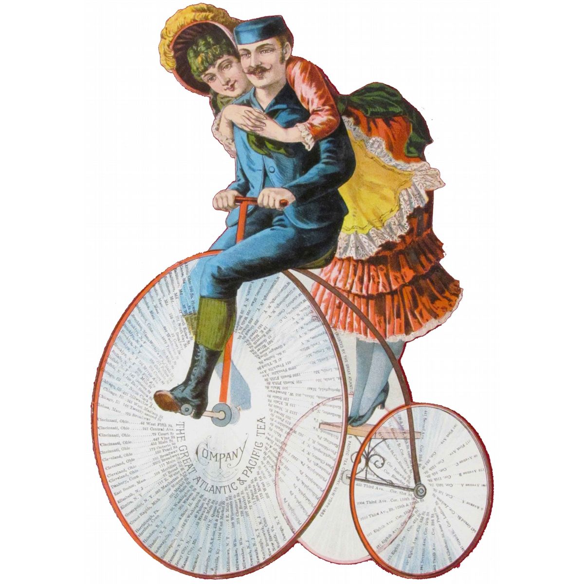 The Great Atlantic & Pacific Tea Co. Die Cut Cardboard Sign. Depicting man & woman on a bicycle, each spoke with a different address of the companies stores. Excellent condition. Framed under glass. 6 3/4 X 9 3/4 inches image only.