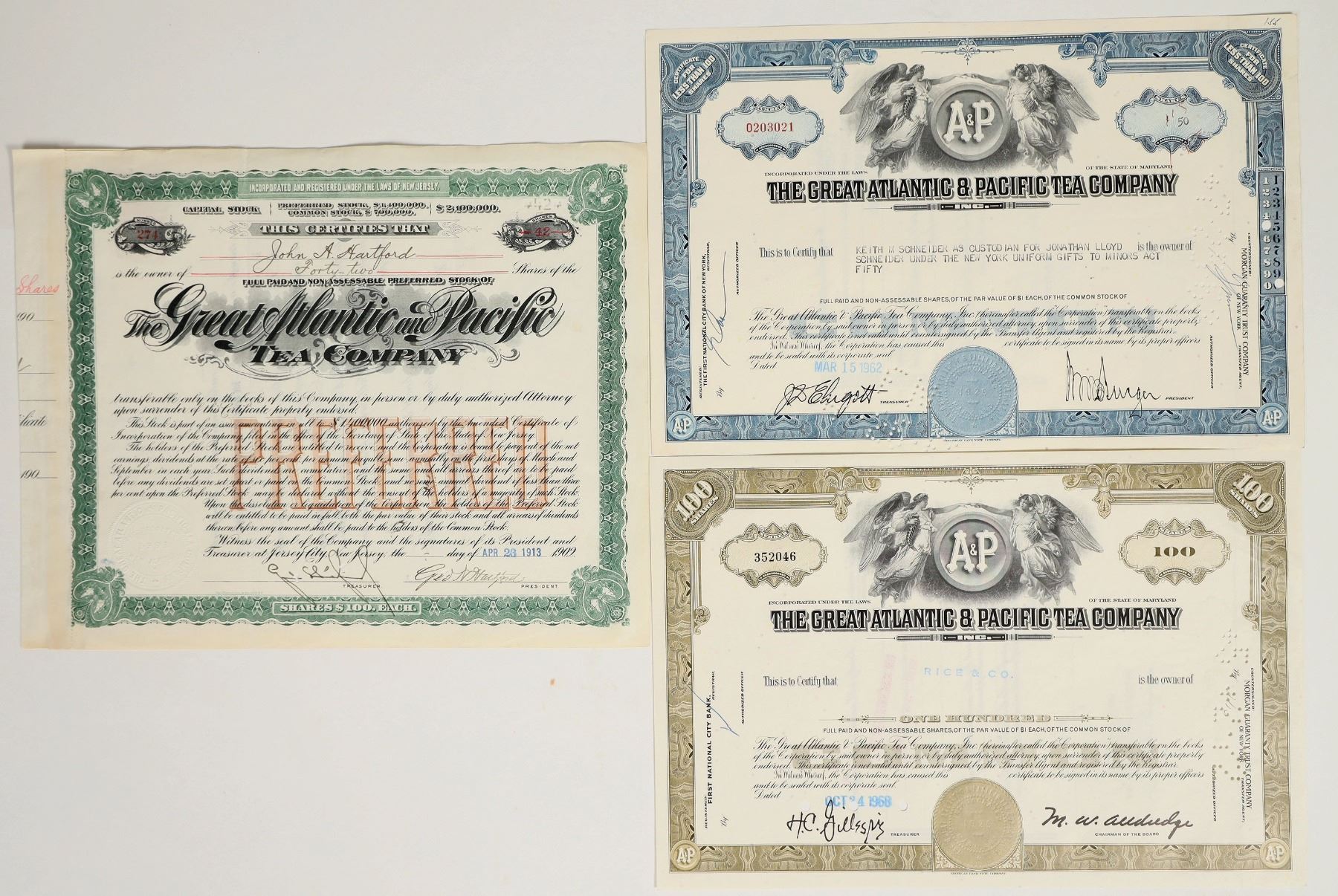 Lot of 3. I/C. Three, The Great Atlantic and Pacific Tea Co. Stocks. 100 shares, less than 100 shares and one for 42 shares. Issued in 1913, 1962 and 1968. One signed by George Hartford President. American BNC printer. This company is better know today as A&P. All in very good cond.