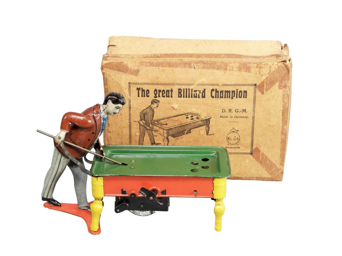 The Great Billiard Champion Tin Wind Up Toy in original box. KI. Co. Schutzmarke, made in Germany. D.R.G.M. A few minor scuffs to the paint otherwise very good condition, box contains tape residue. 6 X 4 1/4 X 2 1/2 inches.