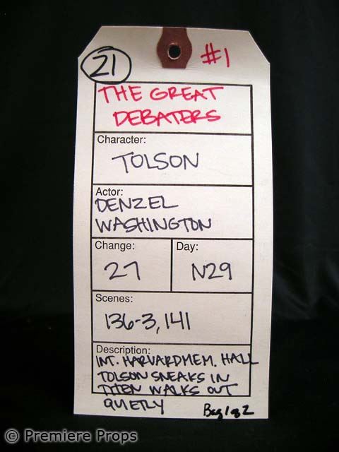 Tolson's (Denzel Washington) "Brooks Brothers" grey wool 6 button suit jacket with pants, and blue dress shirt (custom fitted) (includes wardrobe tag / screen worn). Scene: Harvard mem hall. Denzel's name stitched inside the shirt.