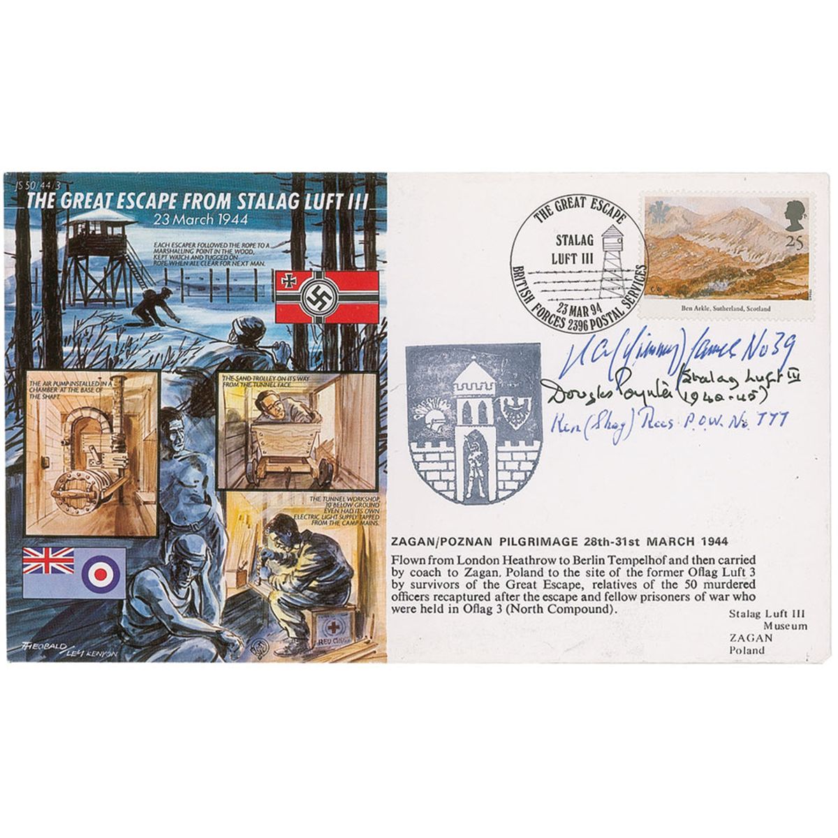 Major escape from the Stalag Luft III POW Camp in Germany during WWII. The location of the camp was selected due to the near impossibility of escape via tunnel. However, in March of 1944, after a year of planning and preparing, Squadron Leader Roger Bushell lead approximately 200 men towards freedom through the simultaneous construction of three tunnels, Tom, Dick, and Harry. Fantastic flight flown commemorative cover with a color cachet honoring The Great Escape from Stalag Luft III, March 23, 1944, 7.5 x 4.5, signed in ballpoint and felt tip by Captain Douglas Poynter, Pilot Officer B. A. (Jimmy) James, and Wing Commander Henry Kenneth Rees. In fine condition, with light creasing.