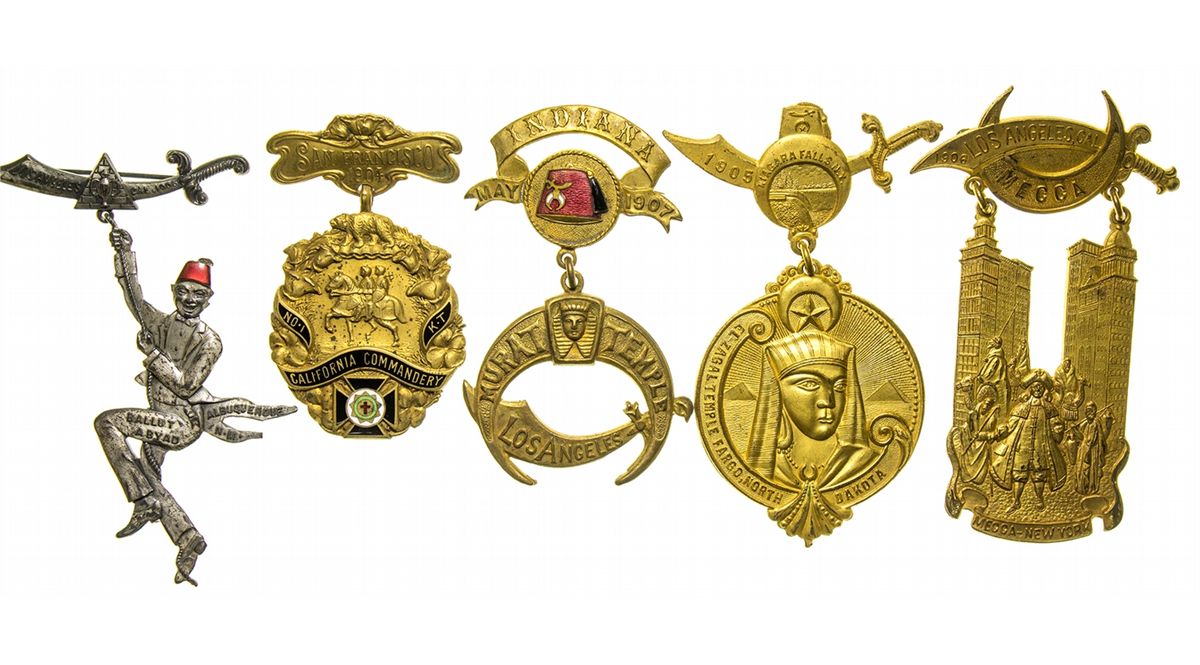 1906 Lot of 5. 1) Los Angeles, CA. Mecca-New York. 1906. Mecca Temple of New York Shiner Convention of 1906, a great medal that has high detail of an important historic event! 2) Los Angeles. El Zagal Temple /Fargo, N.D. 1907. North Dakota. We Supply The World (gold globe medal). 3) Indiana. Murat Temple / Los Angeles. 1907. Shriners who cross half a continent from Indiana Murat Temple to Los Angeles in 1907 were awarded this great Commemorative Medal. 4) Los Angeles, CA. Ballut Abyad Albuquerque, NM. 1906. From the hot sands of New Mexico to the Shrine Convention of LA 1906 comes this great Medal. Not too many of these are around as Ballut Abyad is a small Shrine Temple in Albuguerque. A great rare Medal. 5) San Francisco. No. 1 K.T. California Commandery. 1904. From the First Knights Templar Commandery in California is this Great Membership Medal issued in 1904 for a Conclave the Grand Commandery of California dates back to the early 1850`s right after the first gold rush, as wherever Americans go, Freemasonry follows, and so does the York Rite and Templarism ! With classic Masonic and California Symbols this nice medal is a piece of the tail end of the Old West. - HKA#65082