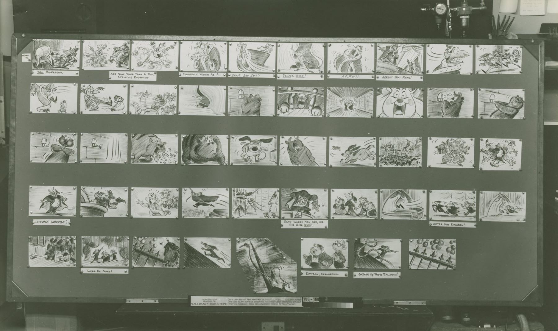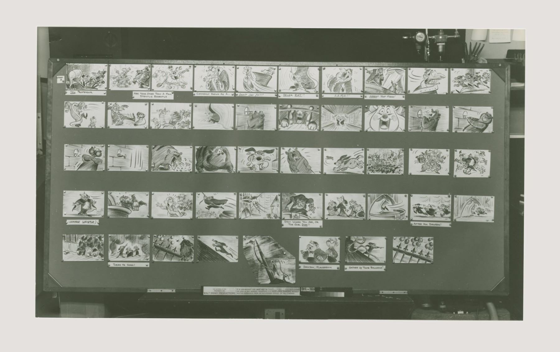 (Disney, 1985) An oversized photo print of a storyboard from “The Great Mouse Detective.” This board shows the beginning of King Ratigan’s downfall. These photographic prints of the storyboards were used by animators for reference during the film’s production. This board dates to January 1985, nearly a year and a half before the film was released. Measuring 12” x 20.5”, the print is in very good condition with light wear from original production use, including staple holes in the top corners that do not affect the image.