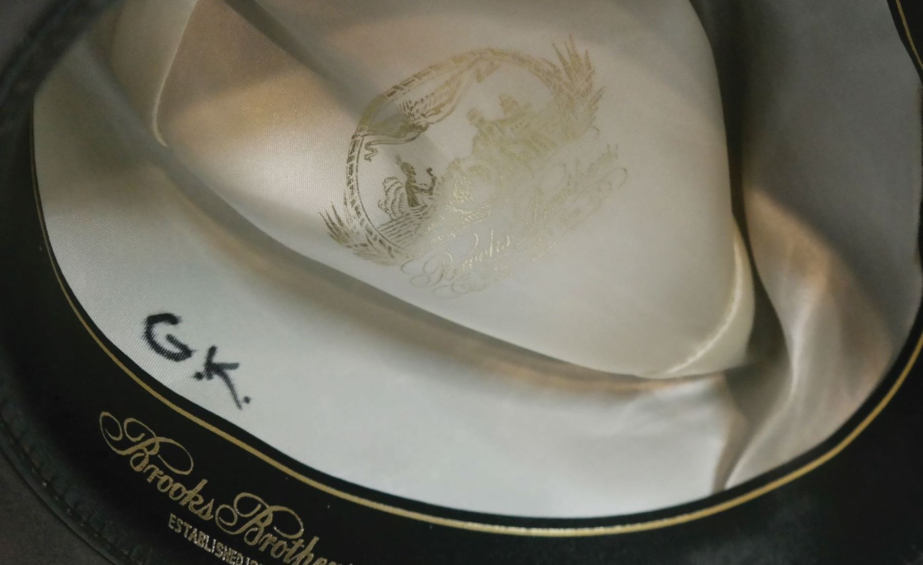 (Disney-MGM, c.1990s) An original prop hat that was used on the Gene Kelly audio-animatronic figure from The Great Movie Ride. The hat was made by Brooks Brothers and is marked with "G.K." on the interior in felt pen. The hat itself measures 12.25"x11" and approximately 4.75" tall and has an opening of 8.5"x7". Constructed of thick felt and ribbon, this prop is in very good condition with minor wear from age and use, including a few small dings to the surface throughout.