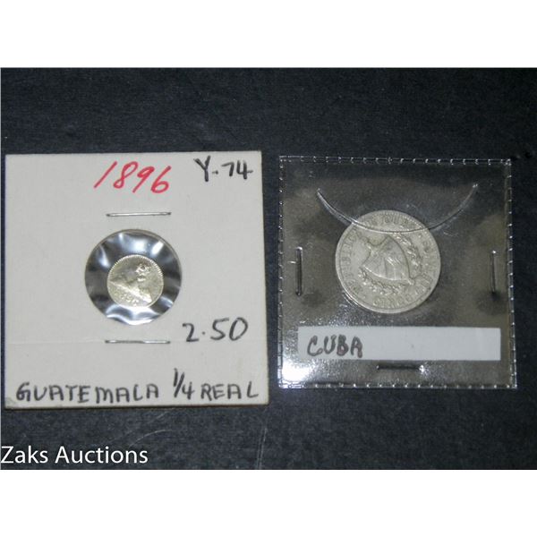 LOT OF 2 FOREIGN COINS. 1896 GUATEMALA 1/4 REAL AND CUBA 1920 5 CENTAVOS