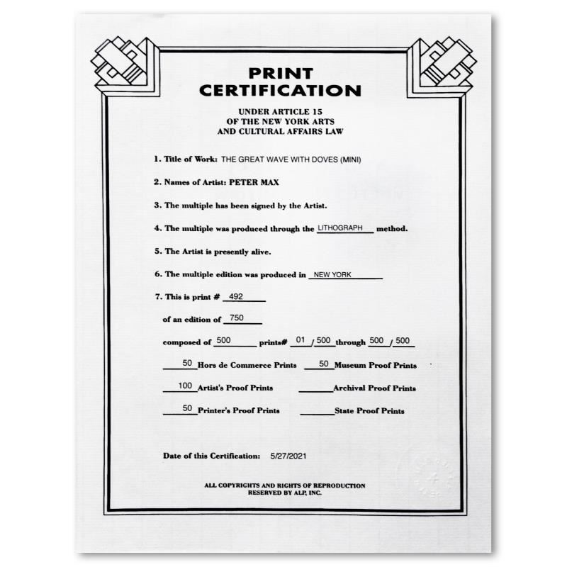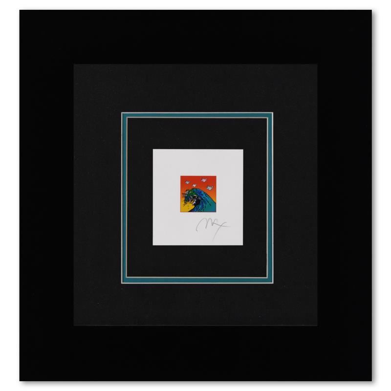 "The Great Wave with Doves" is a limited edition lithograph on paper by Peter Max, numbered 492/500 and hand signed by the artist. This piece comes framed. Includes Certificate of Authenticity from Peter Max Studios. Measures approximately 18" x 19" (frame), 4.5" x 5" (image).