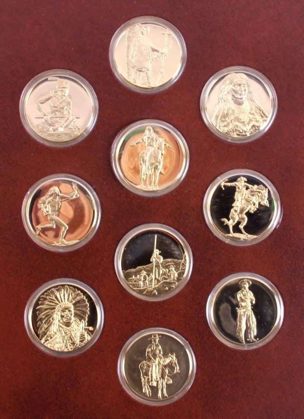 This is "The Greatest Art of the American West" medal collection. The collection includes 50 different medals produced by the Franklin Mint. Each medal is made from solid bronze plated in 24K gold and features an important piece of art. Various artists are represented in this collection such as Frederic Remington, George Catlin, Edward Borein, Charles Russell, Charles Bird King, Thomas Moran, O.C. Seltzer, etc. The collection comes with an index that provides a description of each medal and the artist. The collection of medals is in very good condition. The piece measures 11.5" x 14.5".